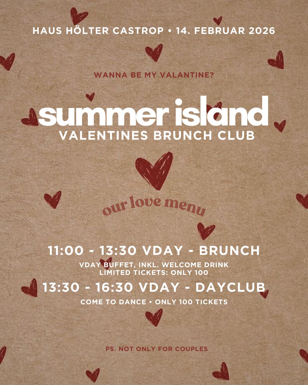 Am Valentinstag laden wir euch zu einem außergewöhnlichen Erlebnis ein – nicht nur für Paare, sondern für alle, die Genuss, Musik und besondere Atmosphäre lieben. Freut euch auf einen stilvollen Brunch mit Live-DJs sowie auf entspanntes Dayclubbing mit den bekannten Summer-Island-Vibes – auf unserer beheizten Terrasse.